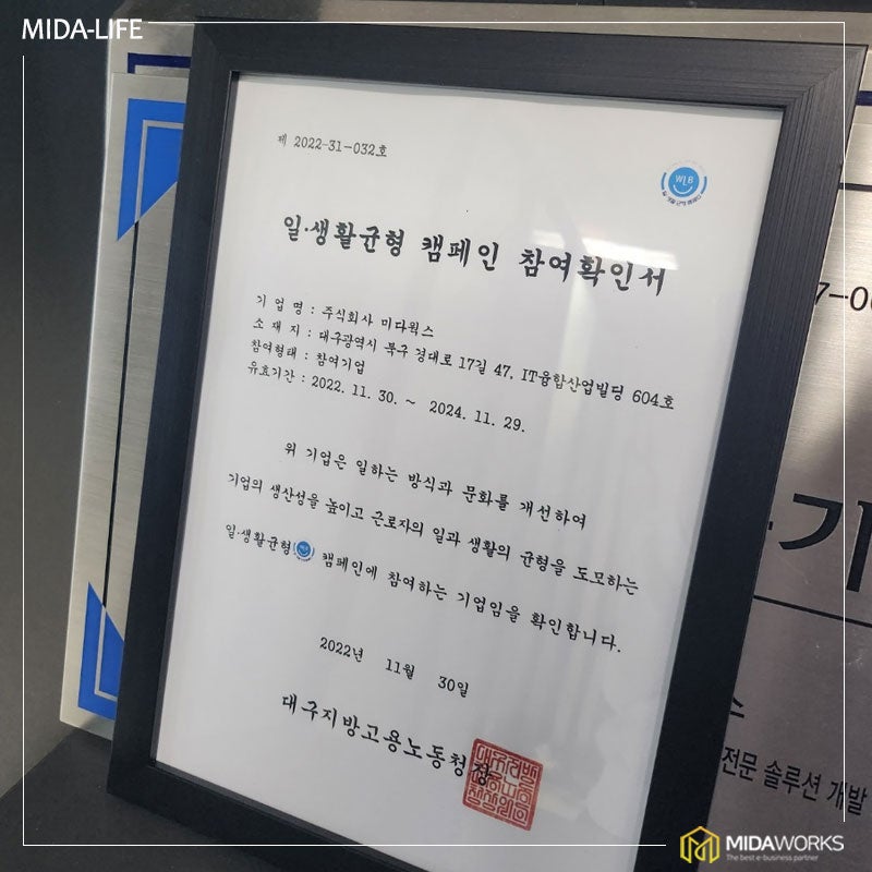 워라밸 좋은 기업 미다웍스, 고용노동부 “일·생활 균형 캠페인” 참여 최근 워라밸(Work-Life Balance)이 주목받으면서 직장인들의 일과 생활의 균형을 추구하는 움직임이 확산되고