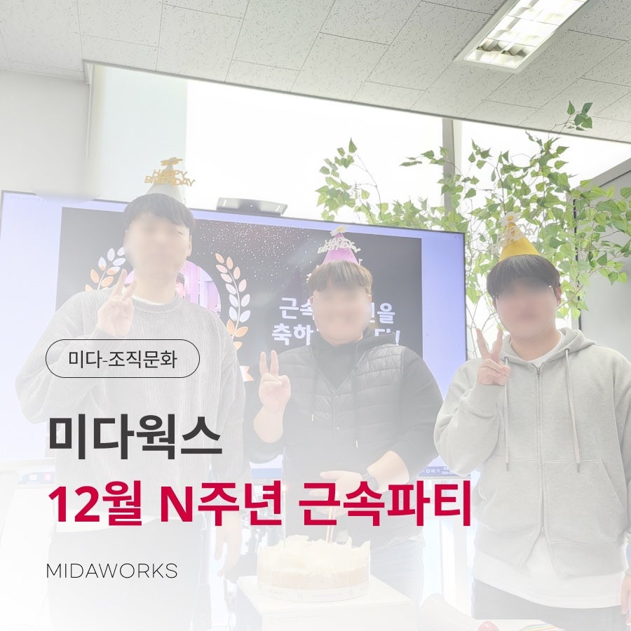 미다소식: 미다웍스 12월 N주년 근속파티 미다웍스가 12월을 맞아 N주년 근속파티를 개최합니다! 이번 근속파티는 미다웍스의 성장과 발전을 함께 축하하고 감사를 표하는