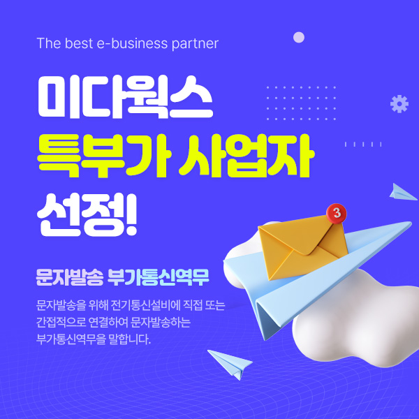 [공지] [미다소식] 미다웍스 2024 특부가사업자 선정! (문자발송 부가통신역무) 미다웍스는 2024년도 특별 부가통신역무사업자로 선정되었습니다. 이에 관련하여 공지드립니다. 미다웍스, 2024 특부가사업자로 선정!