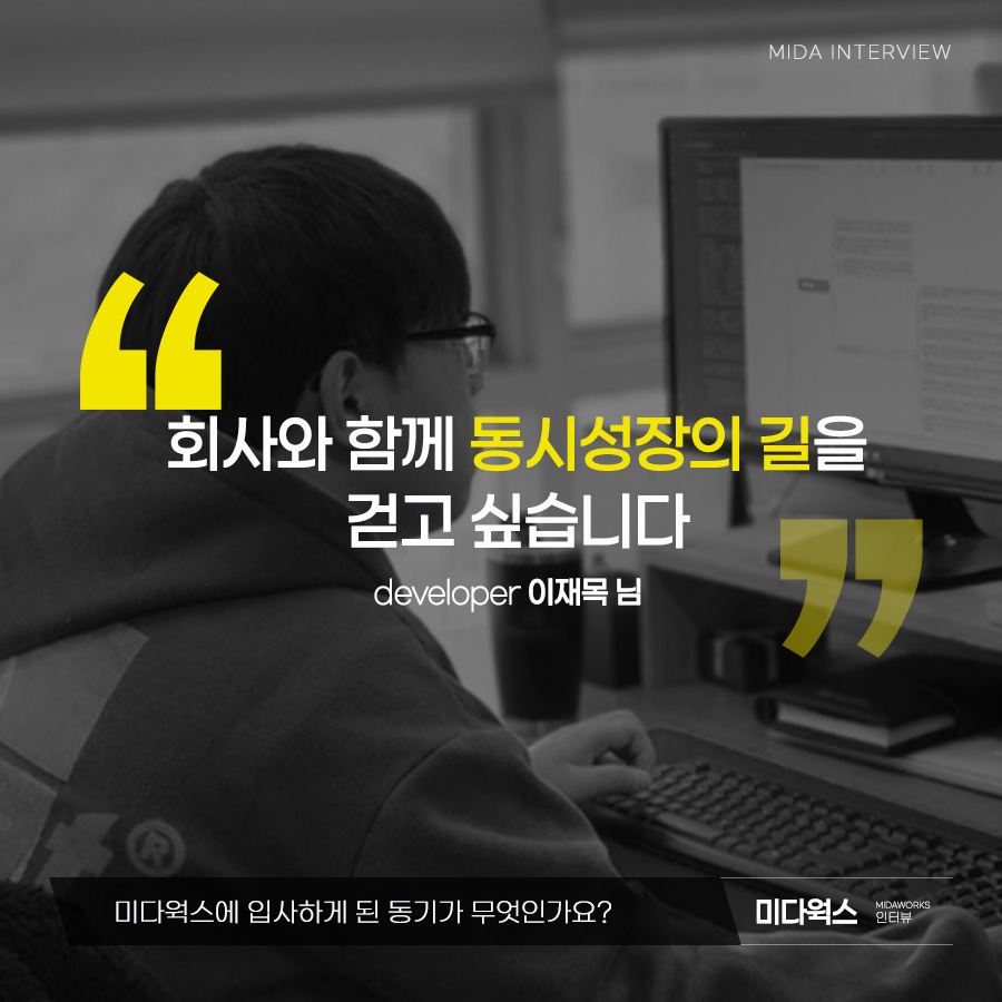 미다웍스 人터뷰 – 신입사원 웹개발팀 이재목 사원의 인터뷰 미다웍스에서 신입 개발자로 입사한 이재목 사원을 만나 인터뷰를 진행했다. 이재목 사원은 웹개발팀에