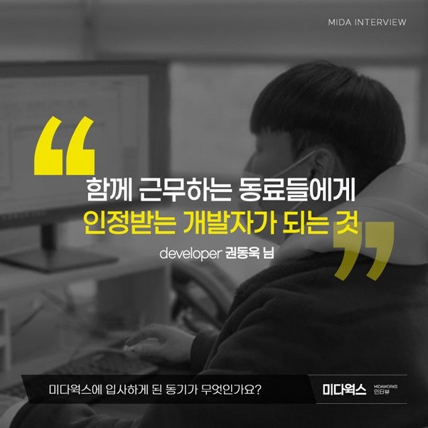 미다웍스 人터뷰 – 웹개발 4년차 경력직! 권동욱 선임 미다웍스(Midaworks)에서는 매주 다양한 분야의 전문가들을 만나볼 수 있는 인터뷰 시리즈인 ‘人터뷰’를 진행하고
