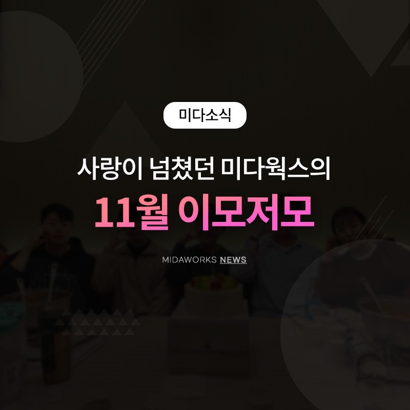 11월 행사: 미다웍스는 11월도 행복하게! 미다웍스에서는 다가오는 11월에도 직원들을 위한 다양한 행사를 준비했습니다. 회사 내에서의 회사복지, 이벤트 그리고 회식 등을